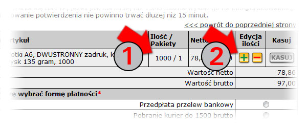 W koszyku pojawi się pierwsza pozycja. W kolumnie (1) [Ilość/Pakiety] pokazane jest ile jest ulotek w danym pakiecie, w przykładzie to 1000 ulotek i 1 pakiet. Jeżeli istnieje potrzeba wydrukowania ulotek w tym samym formacie i nakładzie ale dwa rożne projekty, wtedy należy skorzystać z przycisku (2) [+] aby dodać kolejny projekt, korektę wykonuje się za pomocą przycisku [-]